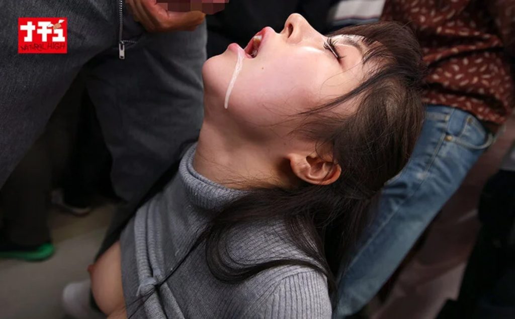 グレーのニットと茶色スカートのお姉さんと電車の中で着衣SEX 顔に精子をぶっかけられてニットも汚されてしまいます