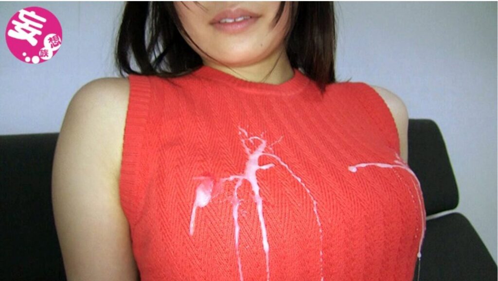 ノースリーブの赤いニットを着用した女性がち○こ2本をフェラ、ち○こをニットのおっぱい部分にこすりつけたり、ニットに精子をぶっかけてどろどろにしてます