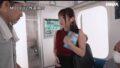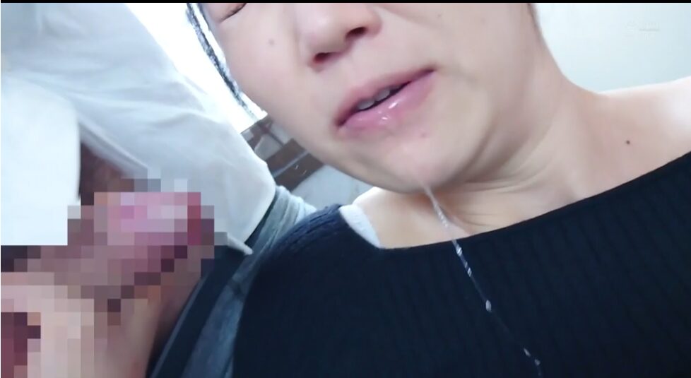 部屋の隅っこで複数の男に囲まれて連続フェラ、口周りに何度も精子をぶっかけられて黒にニットも白く汚れてしまっています。次のシーンではニットのぶっかけられた部分がしみになってしまっています