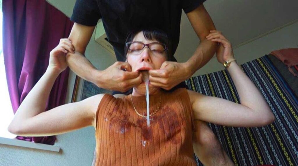 眼鏡姿が色っぽいお姉さんの喉に指を突っ込みよだれを吐き出させて、おっぱいを揉むようにニットに塗り付けます。ニットがどんどん濡れて汚れていってしまいます。。
