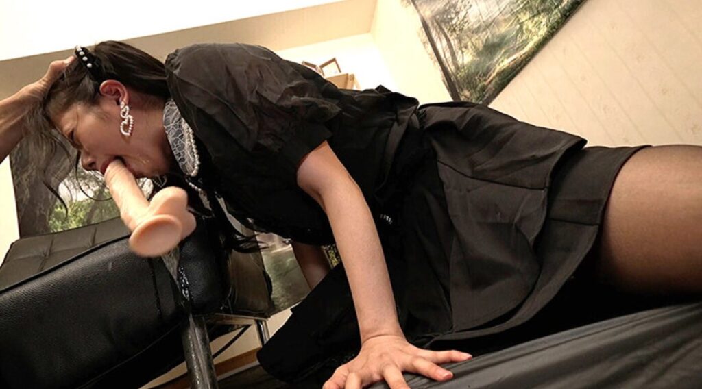 メイド服っぽいデザインでフリルやリボンでかわいいデザインのブラウスとおそろいのスカートを着用した女性にイラマチオ実施、大量のよだれが黒のお洋服にどろどろと流れてべとべとテカテカになってしまっています。。